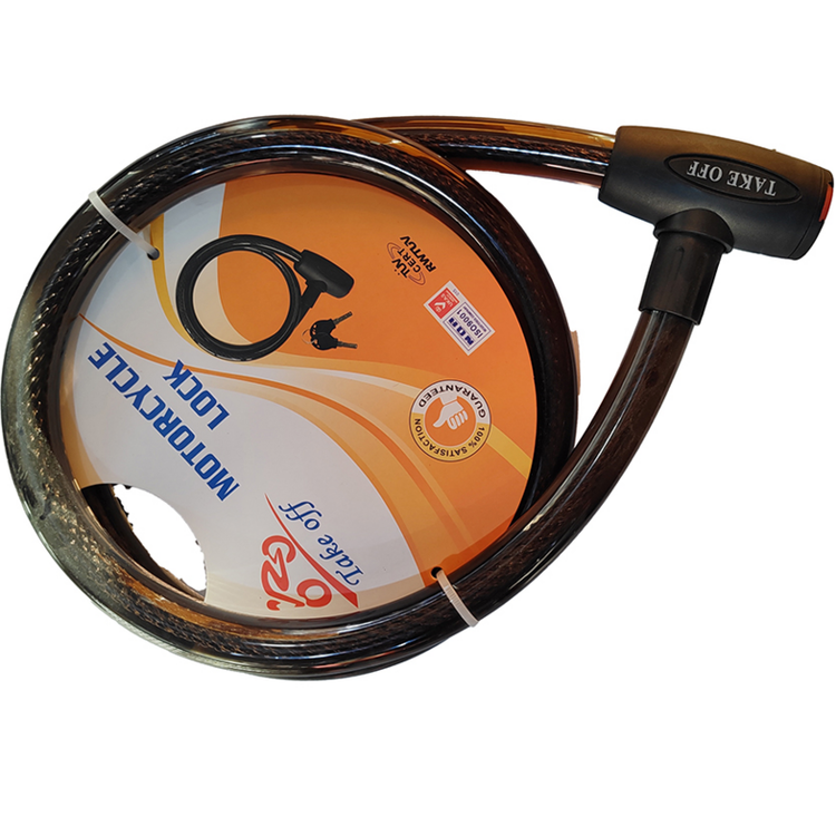 قفل کابلی موتور سیکلت Take Off تیک آف به طول 150 سانتی متر و قطر 2.4 سانتی متر میباشد این قفل دارای کلیدِ کامپیوتریِ چراغ دار و درپوش کلید به روی قفل برای امنیت بیشتر است.