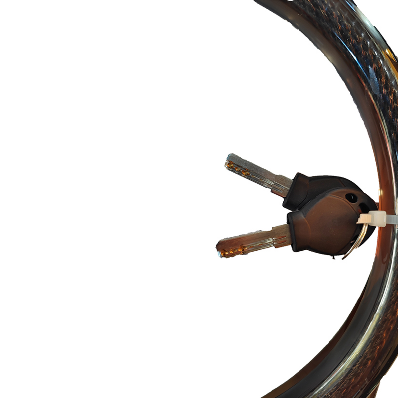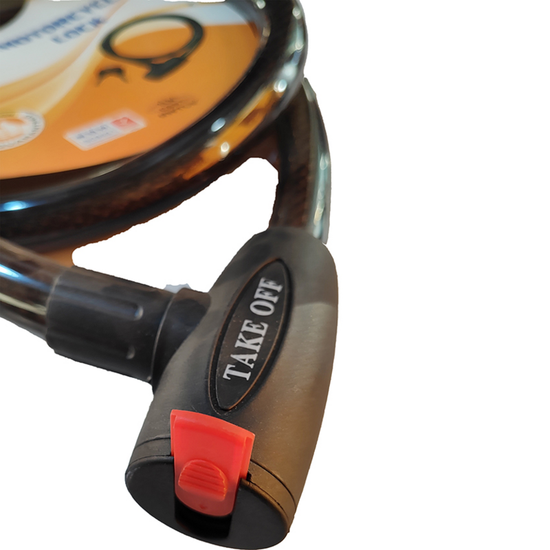 قفل کابلی موتور سیکلت Take Off تیک آف به طول 150 سانتی متر و قطر 2.4 سانتی متر میباشد این قفل دارای کلیدِ کامپیوتریِ چراغ دار و درپوش کلید به روی قفل برای امنیت بیشتر است.